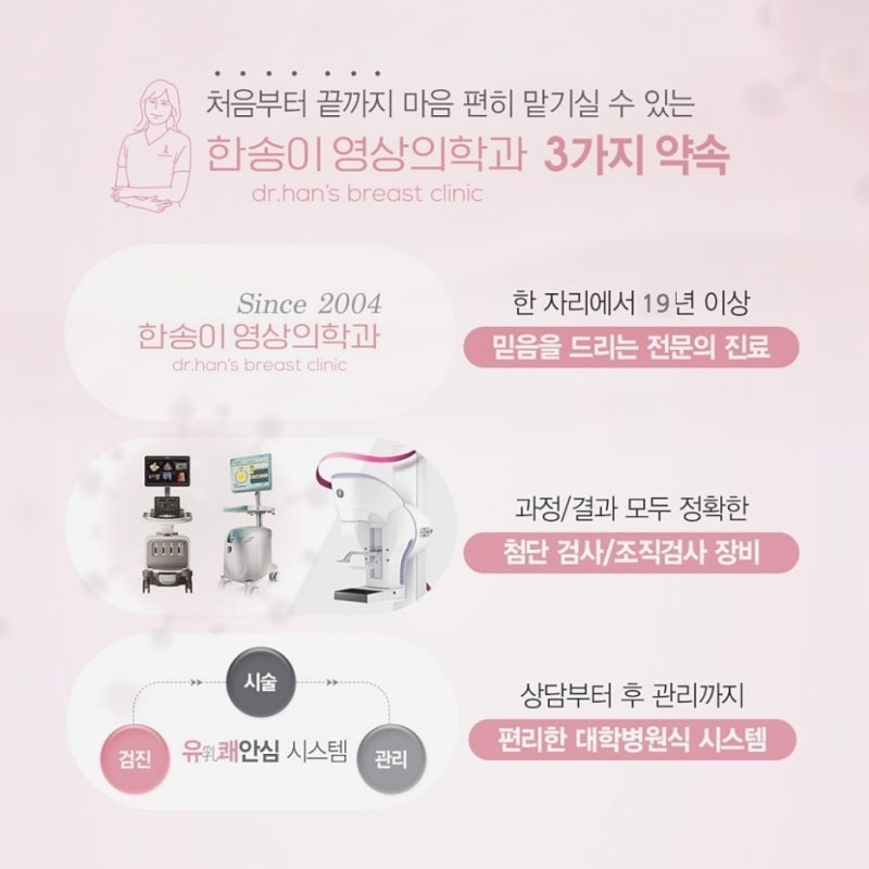 또한 X선과 초음파를 비롯한 검사장비는 검사결과를 보여주는 화면 해상도가 높아 명확해야 합니다. 그래야 이미지 왜곡으로 인한 오진을 최소화할 수 있고 가려 보이지 않는 병변까지 발견할 수 있기 때문입니다.이런 부분들은 최신 트렌드가 좋은 방비일수록 유리하기 때문에 최신 장비를 도입해서 활용하는 곳인지도 함께 체크해 보면 도움이 됩니다.(참고로 아무리 실력이 뛰어난 전문의라도 장비가 제대로 점검되지 않고 노후화되어 있으면 그 뛰어난 실력을 발휘하기가 매우 어렵습니다.)X-RAY, 초음파 외에 조직 검사/맘모톰 수술도 할 수 있는지 꼭 확인하는 것이 좋습니다.유방암 검사는 기본적으로 영상기기를 활용하지만 만약 검진 결과 암으로 의심되는 종양이 발견될 경우 조직검사가 필요할 수 있습니다. 암이 아니더라도 발전 가능성이 있는 경우 맘모톰 수술을 통해 사전에 제거해야 합니다. 또한 이전에 가슴성형을 받으신 분이라면 보형물의 이상 유무를 확인하기 위해 별도의 검사가 필요합니다.따라서 유방암 검사를 받을 때는 이러한 다양한 검사가 종합적으로 이루어지는 곳에서 진료를 받는 것이 좋습니다. 그래야 필요한 검사를 더 빨리 진행할 수 있고 대기 시간이나 불필요한 내원 횟수를 줄이는 데도 도움이 되니까요.(왼쪽) 횡파탄성 초음파 PHILIPS EPIQ ELITE / 맘모톰장비 ENCORENSPIRE (오른쪽) 디지털 저선량 유방촬영장비 GEPRISTINA 본관 내부를 촬영한 사진으로 환불을 금합니다.암 여부를 정확하게 판단하려면 의료진의 전문성과 노하우가 중요합니다!사실 아까 말씀드린 유방 초음파나 유방 X선 등 촬영 장비가 갖춰져 있는 곳이라면 유방 검사는 어디서나 할 수 있습니다.하지만 영상검사 결과를 분석해 양성인지 악성인지 판단하는 것은 영상의학과 전문의의 몫이므로 의료진의 전문성과 노하우에 따라 검사 결과에 대한 판단은 달라질 수 있습니다.실제로 대학병원에서도 MRI나 초음파, 유방촬영 같은 영상진단을 영상의학과 전문의가 담당하고 있습니다.따라서 유방검사병원은 영상의학에 대한 전문성과 지식을 많이 보유한 의료진이 주도하는 곳으로 가는 것이 유리합니다. 많은 경험과 숙련된 노하우를 바탕으로 보다 정확한 검사를 진행할 수 있으니까요.지금 염두에 두고 있는 유방 검사 병원의 ‘입소문’이 많은 곳입니까?유방클리닉 선택일이 어려울 때는 광고나 홍보가 아닌 진료를 직접 받은 환자가 잘한다고 말하는 장소, 즉 ‘입소문’이 있는 장소를 선택하는 것도 좋은 방법입니다.실제로 환자가 다시 찾는 곳도 이런 입소문으로 잘 알려진 곳이 대부분입니다. 왜냐하면 전문성을 기반으로 하면서 양심적인 진료를 하는 병원은 별도의 광고나 홍보를 하지 않아도 환자가 다시 찾아오고 그 환자가 다시 다른 지인에게 소개하는 순환이 생기기 때문입니다.그래서 그런지 사실 저희 한송이 영상의학과도 지인 소개를 통해서 방문했다고 해주시는 분들이 많은데 그런 얘기를 들을 때마다 초심을 잃지 말고 지금처럼 양심적으로 진료해야겠다는 생각이 듭니다.^^오늘은 유방 검사를 조사하고 있는 분을 위해서 유방 검사 병원 선택의 요령을 4가지 전했습니다.한국은 아직 유방 검진에 대한 인식이 높지 않고 모르는 분도 많지만 미국과 유럽에서는 많은 분이 유방 검진 주치의를 정하고 매년 진료를 받고 있습니다.그래서 지금 유방 암 검진을 알아보고 오시면 이번 검사에서 다행히 유방 암이 발견되지 않고 안심한 결과를 얻었다고 해도 오늘 전한 내용을 잘 기억하고 두고 신뢰할 수 있는 유방 암 주치의를 찾아 정기적으로 유방 암 검진을 받도록 추천합니다. 왜냐하면 유방 암이 동양보다는 서양에서 많이 발생했고 40대 이상 중년 여성만 걸린다고 생각하는 경향이 있지만 현재는 갑상선 암을 제치고 유방 암이 한국 여성 암 발생 1위에 오르며 20~30대의 유방 암 환자 수도 착실하게 증가했고, 안심할 수 없는 상황이 되었기 때문입니다.유방 암 검진이 서양의 전유물이 없어졌다는 것이죠.유방암 예방의 달인 10월 유방암 검사를 받으면서 주변 소중한 사람들에게도 유방암 검진을 한 번쯤 권해보는 것도 좋을 것 같습니다.마지막으로 같이 읽으면 좋은 칼럼도 함께 전해드리면서 이것으로 포스팅을 마치겠습니다. 긴 글 읽어주셔서 감사합니다.유방암 검사 연령이 더 낮아졌다? 새로운 가이드라인 발표 대한민국에서는 만 40세 이상이 되면 국가암검진 안내서가 우편으로 발송됩니다. 그중에서 여성에 해당하는… blog.naver.com유방암 검사 연령이 더 낮아졌다? 새로운 가이드라인 발표 대한민국에서는 만 40세 이상이 되면 국가암검진 안내서가 우편으로 발송됩니다. 그중에서 여성에 해당하는… blog.naver.com유방 검사 하나만 받으면 돼? 영상의학과 전문의가 말하는 핵심 보통 유방암 검사에서는 양쪽 유방을 2차원적인 형태로 촬영하는 유방 촬영이나 탐촉자를 이용하는 유방 초음파… blog.naver.com유방 검사 하나만 받으면 돼? 영상의학과 전문의가 말하는 핵심 보통 유방암 검사에서는 양쪽 유방을 2차원적인 형태로 촬영하는 유방 촬영이나 탐촉자를 이용하는 유방 초음파… blog.naver.c