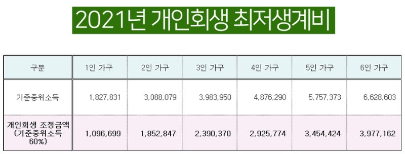 ■ 개인재활최저생계비 1. 지난해 1인당 124만원이었는데 올해 124만원으로 인상됐다. 개인회생 부양가족이 있는 경우 본인을 포함한 2인은 220만원, 3인은 282만원, 4인은 343만원을 받게 된다.2. 배우자 소득이 높거나 동거하지 않는 사람이 부득이하게 포함되는 경우에는 거부될 수 있다고 하더군요.3. 원금 90%, 이자 100%까지 면제된다고 하더군요.4. 상환금을 갚은 후 수입 중 남은 금액을 저축하거나 지출하는 것이 가능하다고 했다.