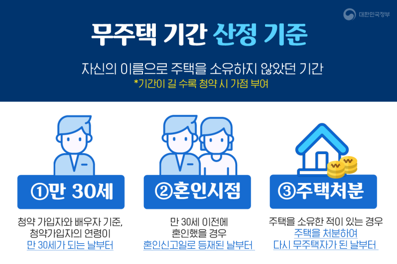 기본적으로 가구 구성원에는 가구를 대표하는 세대주와 그 배우자, 부모와 조부모, 자녀와 손자 및 배우자의 직계비속 등이 포함되며, 그 중에서도 주민등록등본상 기재된 인원만을 의미합니다. 무주택 세대주 기준은 대표자와 구성원 전원이 본인 소유의 분양권이나 집을 가져서는 안 되며, 주민등록등본에 등재되지 않은 구성원은 세대원으로 인정되지 않습니다.또한 형제, 자매는 직계존비속에 속하지 않기 때문에 이들이 아파트를 보유하고 있다는 사실은 무주택 가구 구성원 자격에 일절 영향을 미치지 않습니다. 아울러 세대주가 만 30세 때를 기점으로 소유한 집이나 분양권 여부를 점검하는데 해당 사항이 없으면 무주택 기간으로 인정해 줍니다. 만약 그 이전의 연령에 결혼했다면 혼인 신고일로부터 기간을 산정합니다.