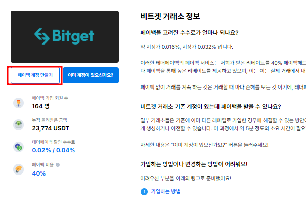 비트겟(BitGet)은 선물거래량 기준 약 4위를 차지하고 있는 해외 거래소입니다. 상당히 높은 순위의 거래소인 만큼 어느 정도의 안정성은 보장된다고 볼 수 있습니다. 추가적인 안정성을 보여주기 위해 Bitget은 POR(Proof-Of-Reserves), 즉 지급준비율이라는 지표를 공개합니다. 이 지표는 거래소가 보유하고 있는 자산 대비 고객 예치금의 비율을 나타내며, 현재 비트겟은 244%를 기록하고 있습니다. 높은 지급준비율을 유지하고 있어 어떤 위기 상황에서도 비트겟이 고객의 예치금을 안전하게 돌려줄 수 있다는 뜻이다. 3. 수수료 팁 수수료 할인을 받을 수 있는 팁도 알려드립니다. 비트겟에서 선물을 거래할 때 Maker의 경우 0.02%(한정가 거래), Taker의 경우 0.04%(시장가 거래)의 수수료율이 적용됩니다. 하지만 효율성을 극대화해야 하기 때문에 수수료 혜택을 받을 수 있는 방법을 알아보겠습니다. 우선, 기존에는 추천링크를 통해 할인을 추천해 드렸습니다. 하지만 추천링크에는 사각지대가 있었습니다. 기본 시스템은 할인을 받는 추천 링크였는데, 링크를 가진 인플루언서는 우리의 거래량만큼 할인을 받았는데… 최근에는 Tether Payback이라는 새로운 사이트를 통해 수수료 할인을 받을 수 있습니다. Tether Payback의 경우, 위 사진과 같이 기존 인플루언서들이 받았던 수수료 혜택을 이제 유저들에게 직접 페이백하는 형태로 제공되고 있습니다. 이 서비스를 이용하시면 시드 5,000 USDT 기준으로 월 400 USDT의 혜택을 받으실 수 있다고 합니다. 이는 평균적인 수치라고 합니다. 물론 거래량에 따라 달라질 수는 있겠지만 매력적으로 보입니다. 혜택을 받는 방법은 간단합니다. 아래 링크를 통해. Tether Payback 사이트로 이동하여 Google 계정으로 로그인하세요. 과장없는 리얼 페이백, 테더투맥스 – 1인당 평균 페이백 33만원! Max로 Tether를 돌려받으세요. 회원관리를 통해 페이백을 관리하실 수 있습니다. tetherpayback.com 그 후 ‘지원되는 거래소’ 탭에서 BitGet을 찾아 ‘Payback 시작’ 버튼을 클릭한 후 ‘Payback 계정 만들기’ 버튼을 클릭하여 등록 절차를 완료하세요. 그냥 완료하세요. 4. 신규 이벤트 요약 추가 혜택을 알려드리기 위해 현재 비트젯에서 신규 가입자를 대상으로 대규모 이벤트가 진행 중이라는 점을 안내드립니다. 위에서 설명한 Tether Payback을 통해 받을 수 있는 혜택과는 별개의 혜택이라고 생각하시면 됩니다. 먼저 요약하자면, 1. 가입하고 거래하시면 100 USDT를 드립니다. 2. 입금 후 선물거래로 이체하시면 10% 리베이트를 받으실 수 있습니다. 3. 선물거래량에 따라 지급됩니다. 우선 1번은 쉽습니다. 가입하고 거래하세요. 이렇게 하면 100 USDT를 받게 됩니다. 다음 단계는 10% 보증금을 기준으로 한 리베이트입니다. 10% 리베이트이며 최대 100 USDT까지 지원되므로 10,000 USDT 정도 입금하시면 Max 혜택을 누리실 수 있습니다. 마지막 단계는 거래량에 따른 혜택입니다. 10,000 USDT이면 50 USDT의 보너스가 주어지고, 100일 이내에 거래량으로 500,000 USDT를 달성하면 200 할 수 있는 용기가 생긴 것 같아서 긍정적인 기분이 듭니다. 5. Bitget 및 KYC 가입 방법 위 Tether Payback 링크를 통해 가입하시면 1단계에서 추천할인이 반영되는 것을 보실 수 있습니다. 이제 계속해서 가입하실 수 있습니다. 개인적으로는 전화번호보다는 안전한 이메일 주소를 사용하는 것을 추천하고, 비밀번호도 기억할 수 있도록 가장 복잡한 비밀번호를 선택하는 것을 추천합니다. 회원가입을 클릭하시면 회원가입 시 등록하신 이메일이나 휴대폰으로 간편봇인증과 6자리 인증이 발송됩니다. 기본 등록 절차를 완료하려면 번호를 입력하세요. 다음은 여행규칙 준수를 위해 꼭 필요한 KYC(신원확인) 절차입니다. 위에서 설명한 바와 같이 회원가입 시 반드시 한국계좌와 동일한 이름으로 KYC를 받으셔야 합니다. 확인 절차를 시작하려면 계정 설정에서 ‘신원 확인’을 선택하세요. 대부분의 경우 1단계 인증으로 충분하며, 신분증과 안면인식을 통한 인증이 필요합니다. 국가 선택 시 ‘대한민국’을 선택하고 신분증은 여권, 운전면허증, 주민등록증 중 하나를 사용하세요. 여행 규정을 준수하기 위해 선택하신 ID는 한국 거래소 계좌의 이름과 일치해야 합니다. 다음으로 이름과 성을 정확하게 입력하고, 신분증을 휴대폰으로 촬영하여 제출하시면 KYC 인증 절차가 완료됩니다. 비트겟 가입방법과 수수료 꿀팁을 확인해 봤습니다. 다들 성공적인 거래되시길 바랍니다.