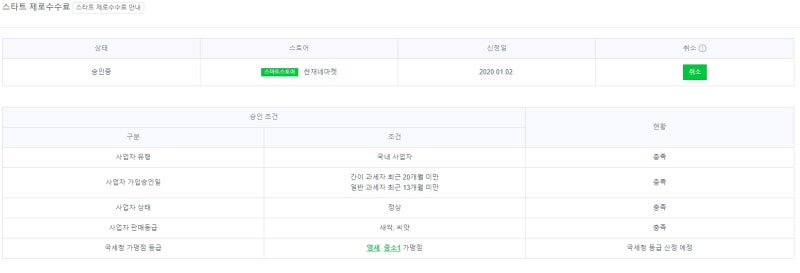 저도 신규 사업자라 부가가치세 신고가 아직 한 번도 안 돼서 스타트 제로 수수료에 참여하는데 바로 조건이 안 됐어요. 특히 간이과세자의 경우 최대 1년까지 기다려야 할 것 같습니다.제가 운영하는 스마트스토어는 9월 8일 일반과세자로 승인되고 1월 부가가치세 신고가 들어온 후 조건이 달성될 예정이므로 ‘국세청 등급 산정 예정’이라고 되어 있습니다.충족 조건이 될지 어떨지 모르게 되면 사실 고민할 필요는 없습니다.수수료 제로 프로그램에 해당하는 셀러에게는 스마트스토어 판매자 센터에 접속하면 팝업으로 공지하고 있습니다.단, 신청 기간에 대해 주의할 점이 있습니다. 스마트스토어 사업자 가입 승인일 기준, 그리고 사업자 등록 과세 유형에 따라 일반 과세자는 최근 13개월 미만 간이 과세자는 20개월 미만 이내에 해당 프로젝트를 신청해야 합니다.제로 프로그램은 두 가지 유형의 수수료를 무료로 지원합니다.매출 연동 수수료는 최대 6개월과 주문 관리 수수료는 최대 12개월입니다.이번 달 승인 요청 시 일괄적으로 2월 1일부터 혜택을 받게 됩니다.네이버 스마트스토어에서 온라인 창업을 시작하시면 수수료 제로 프로그램을 꼭 활용해보세요~