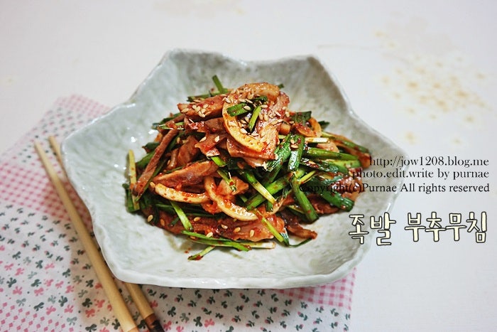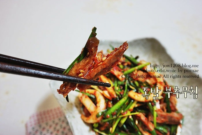 족발은 단독으로 먹어도 맛있는 반찬이다. 부추와 족발 양념을 넣어 만들어도 술안주로 아주 좋습니다. 족발이 살짝 매콤한 느낌이 든다면 족발 양념을 만들어보세요^^