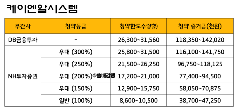 이번 공모를 통해 조달된 자금은 KNR시스템의 시설자금과 운영자금으로 사용될 예정이다. 2024년부터 2026년까지 시설자금에 가장 많은 금액을 투자할 예정이며, 본사 이전을 통해 사업 확장에 노력할 것으로 예상된다. 개인적으로 나쁘지 않다고 생각하는 KNR 시스템 수요전망 결과를 살펴보겠습니다. K&R시스템 수요예측 결과. K&R시스템 수요예측에는 기관투자자 2,053명 등 많은 분들이 참여해 주셨습니다. 기관경쟁률은 873.20 대 1이었다. K&R시스템은 예상대로 수요예측에서 좋은 결과를 얻었다. 시스템의 공모희망가는 9,000원에서 11,000원으로 제출됐다. 수요예측 적용 가격 분포를 보면 11,000원 상한선을 넘는 가격이 많다. 특히 14만원 이상 많은 분들이 참여해 주셨습니다. 의무보유 확인에는 302명이 참여했으니 결과는 나쁘지 않습니다. 공모가 상한선을 넘는 수요예측을 받아 공모가 13,500원으로 확정된 공모주이다. 이번 코스닥 상장을 통해 유압로봇시스템 제품의 본격적인 상용화에 착수할 것으로 기대된다. 개최하게 되면 공모가격 등을 한번에 정리해드립니다. 한 번 보자. KNR 시스템 청약일정 정규시장일 공모가 요약 KNR 시스템 공모주 청약이 다음주 2월 26일과 2월 27일에 진행됩니다. 공모가는 13,500원, 주당 6,750원으로 계산! 주관사는 DB금융투자와 NH인베스트먼트이다. 증권사가 공동으로 진행하기 때문에 당일 청약경쟁률을 보고 낮은 쪽으로 가시면 됩니다. NH투자증권 계좌는 많고, DB는 많지 않은 것 같아 DB 경쟁률이 낮을 가능성이 있습니다. 상장일은 3월이다. 8일이니 배정받은 주식이 있다면 확인하고 팔아보세요! 니가하길 바래. 오늘은 다음주에 진행되는 공모주 K&R 제도에 대해 알아봤습니다. 관심있는 분들에게 도움이 되었으면 좋겠습니다. 감사합니다* 본 포스팅은 주식추천이 아닙니다* 투자는 본인의 판단입니다.
